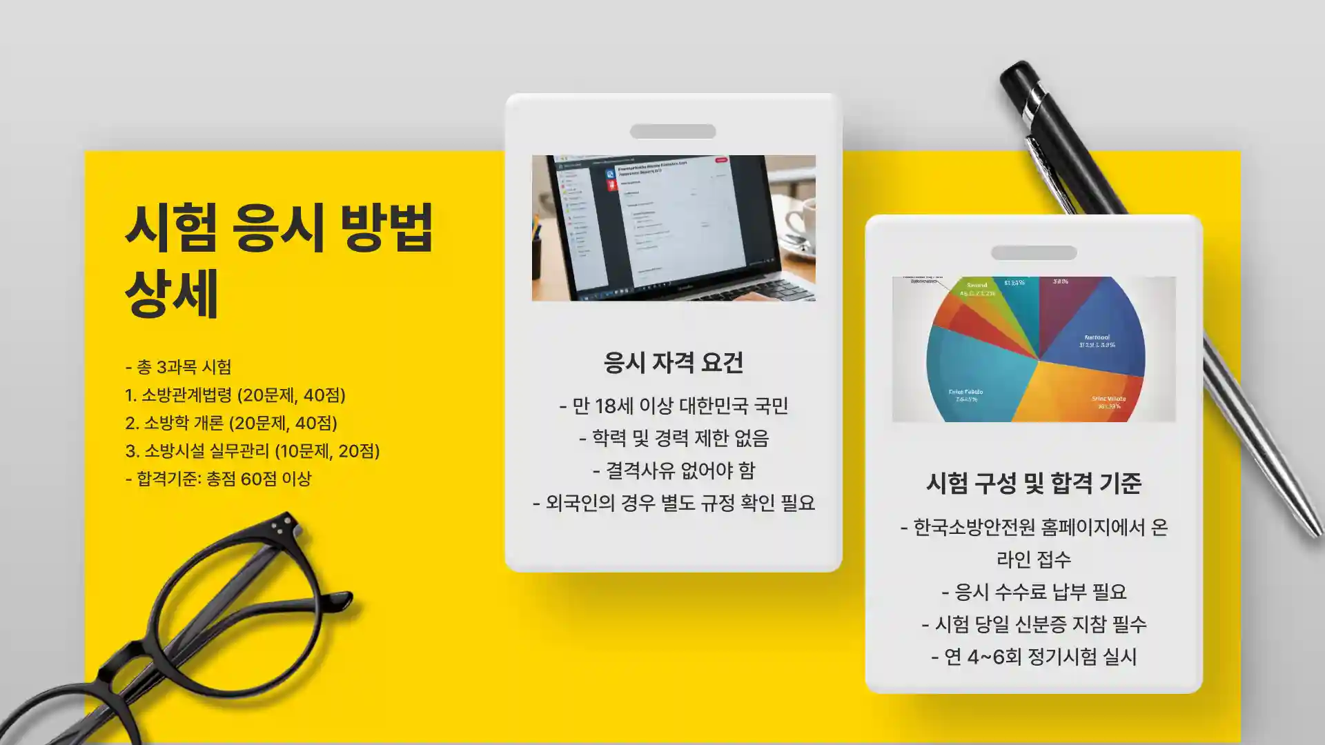| 시험 과목 | 소방관계법령, 소방학개론, 소방시설 실무관리 (총 100점 중 60점 이상) |